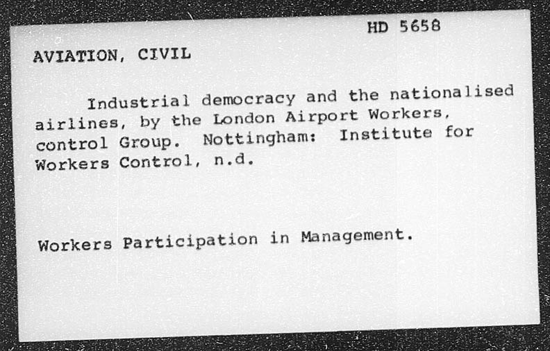 HD 5658 __ AVIATION, CIVIL industrial democracy and the nationalised airlines, by the London Airport Workers, control Group. Nottingham: Institute for Workers Control, n.d. Workers Participation in Management.