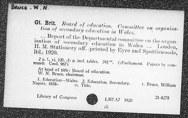 Gt. Brit, Board of educatian, Committee on organisa- tion of seconday � education in Wales. . Report of the De partinental committee on the or gan isation of secondary education in Wales .., London, H. M. Stationery off. ?printed by Eyre and Spottiswoode, ltd.; 1920. ? 2p. 1, vi, 131, (2) p. incl. tables. 244ø", (Parliament. Papers by com- mand) Cmd. 96 67) At head of title: Board of educ ation, W. N. Bruce, chairman. 1: ieee Wales. 2. Education, Secondary, 1. Bruce, William Napier, 1853. . Title, 21-8278 Library of Congress
