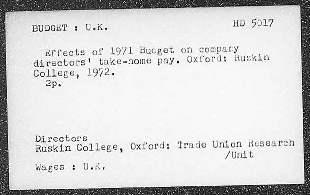 BUDGET : U.K. effects of 1971 Budget on company directors' take-home paye Oxford: Ruskin College, 1972. 20. Directors Ruskin College, Oxford: Trade Union nesearch /Unit Wages 3: Une