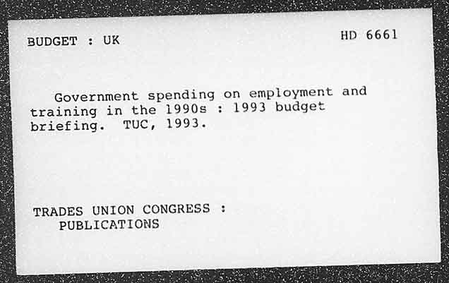 BUDGET : UK HD 6661 Government spending on employment and training in the 1990s : 1993 budget briefing. TUC, 1993. TRADES UNION CONGRESS : PUBLICATIONS