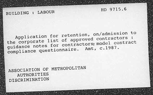 Ce dee ae So MA CONTE ee mR re roa ott Pies ecaee nt @ BUILDING : LABOUR HD 9715.6 Application for retention, on/admission to the corporate list of approved contractors guidance notes for contractors; model contract compliance questionnaire. Amt, c.1987. ASSOCIATION OF METROPOLITAN : AUTHORITIES = DISCRIMINATION