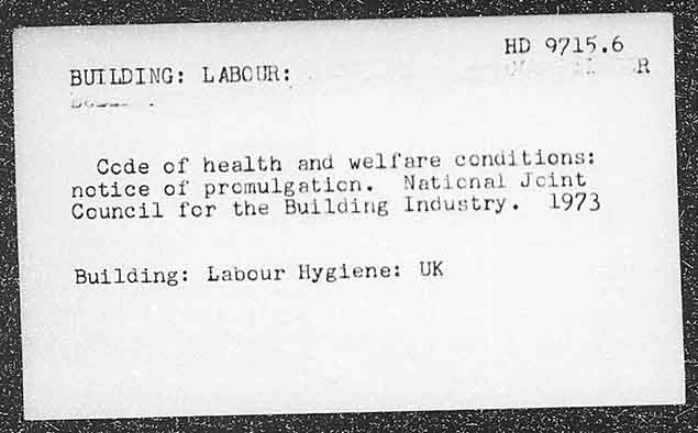 HD 9715.6 BUILDING: LABOUR: li R bat + et me Code of health and welfare eonditions: notice of promulgation. Naticnal Jcint Council for the Building Industry. L973 Building: Labour Hygiene: UK
