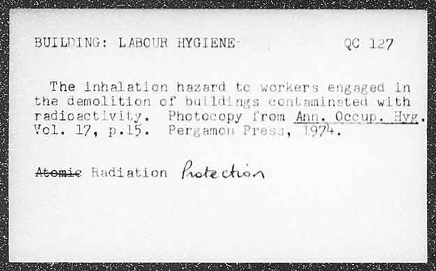 BUILDING: LABOUR HYGIENE w 127 The inhalation hazard to workers engaged in the demolition of buildings itamineted with ?& radioactivity. Photocopy fre nn. Occup, Hve.m ?w Ost e7 9: Dea )s Pergamon Press, FL, , Atemic Hadiation pote ction