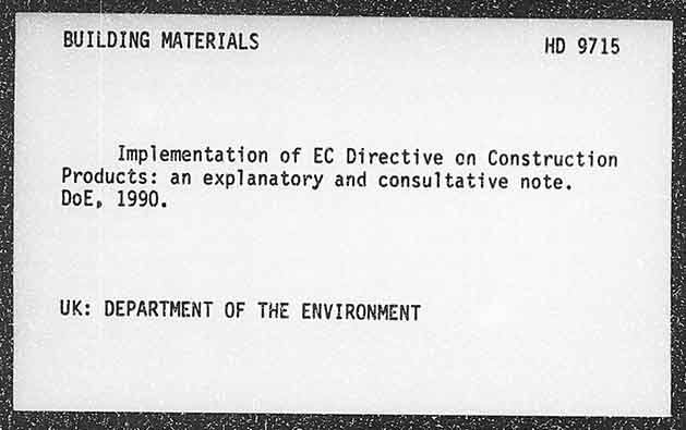BUILDING MATERIALS HD 9715 Implementation of EC Directive on Construction Products: an explanatory and consultative note. DoE, 1990. UK: DEPARTMENT OF THE ENVIRONMENT
