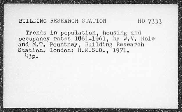 BULLDING RESHARCH STATION HD 7se3 Trends in population, housing and occupancy rates 1661-1961, by W.V. Hole and M.T. Pountney, Building Research Station. London: H.M.5.0., 1971. ?3p.