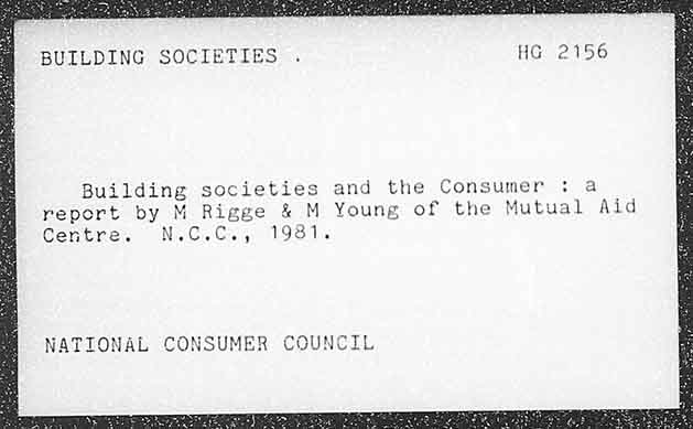 BUILDING SOCIETIES Building societies and the Consumer ; a report by M Rigge & M Young f the Mutual Aid Senunernc Nac... 1991. NATIONAL CONSUMER COUNCIL