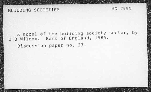 BUILDING SOCIETIES A model of the building society sector, by 3B Wilcox. Bank of England, 1985. Discussion paper no. 23.