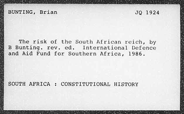 BUNTING, Brian JQ 1924 The risk of the South African reich, by B Bunting. rev. ed. International Defence and Aid Fund fer Southern Africa, 1986. SOUTH AFRICA : CONSTITUTIONAL HISTORY