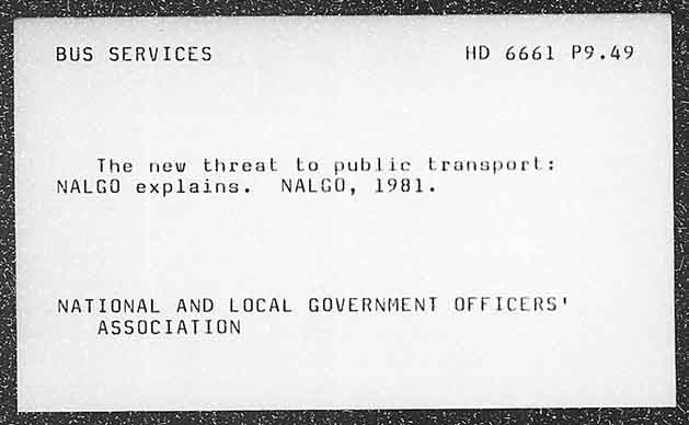 BUS SERVICES HD 6661 The new threat to public transport: NALGO explains. NALGO, 1981. NATIONAL AND LOCAL GOVERNMENT OFFICERS' ASSOCIATION