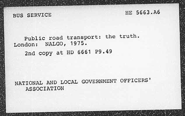BUS SERVICE HE 5663.A6 Public road transport: the truth. London: NALGO, 1975. 2nd copy at HD 6661 P9.49 NATICNAL AND LOCAL GOVERNMENT QOFFICERS' ASSOCIATION