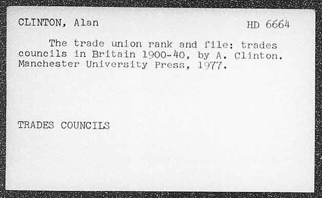 CLINTON, Alan HD 6664 The trade union rank and file: trades councils in Britain 1900-40, by A. Clinton. Manchester University Press, 1977. TRADES COUNCILS