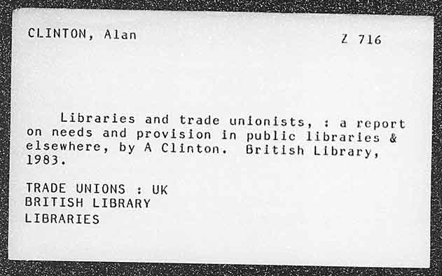 CLINTON, Alan Libraries and trade unionists, : a report on needs and provision in public libraries & elsewhere, by A Clinton. British Library, 783ř. TRADE UNIONS : UK BRITISH LIBRARY LIBRARIES