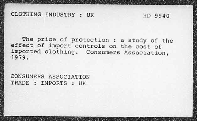 CLOTHING INDUSTRY : UK HD 9940 The price of protection : a study of the effect of import controls on the cost of imported clothing. Consumers Association, 1.99797. CONSUMERS ASSOCIATION TRADE : IMPORTS ;: UK