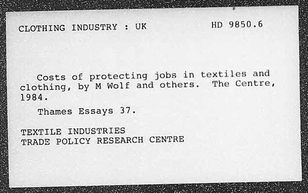 CLOTHING INDUSTRY : UK HD 9850.6 Costs of protecting jobs in textiles and clothing, by M Wolf and others. The Centre, 1984. Thames Essays 37. TEXTILE INDUSTRIES TRADE POLICY RESEARCH CENTRE