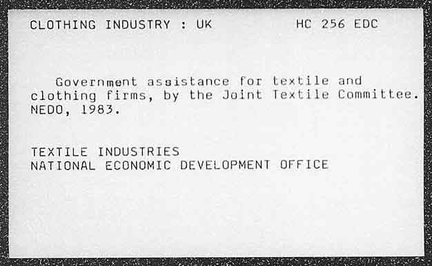 CLOTHING INDUSTRY 3: UK Honeoo =U G Government assistance for textile and clothing firms, by the Joint Textile Committee. NEDO, 1983. Heel EeskNDUSTRIES NATIONAL ECONOMIC DEVELOPMENT OFFICE