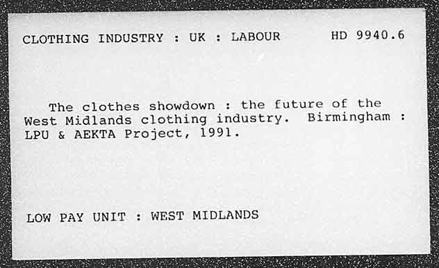 CLOTHING INDUSTRY : UK : LABOUR HD 9940.6 The clothes showdown : the future of the West Midlands clothing industry. Birmingham LPU & AEKTA Project, 1991. LOW PAY UNIT : WEST MIDLANDS