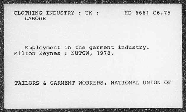 CLOTHING INDUSTRY Ws HD 6661 C6.75 LABOUR Employment in the garment industry. Milton Keynes : NUTGW, 1978. TAILORS & GARMENT WORKERS, NATIONAL UNION OF
