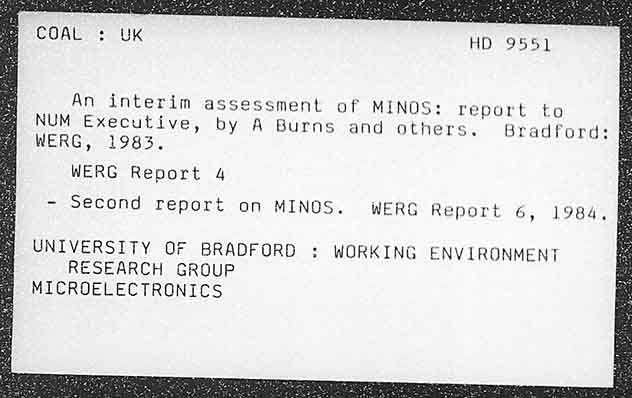 COAL: HD 955 An interim assessment of MINOS: report to NUM Executive, by A Burns and others. Bradford: ? WERG, 1983. WERG Report 4 - Second report on MINOS. WERG Report 6, 1984, UNIVERSITY OF BRADFORD : WORKING ENVIRONMENT RESEARCH GROUP MICROELECTRONICS