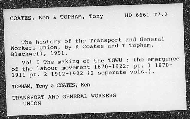 COATES, Ken & TOPHAM, Tony HD 6661 T7.2 The history of the Transport and General Workers Union, hy K Coates and T Topham. Blackwell, 1991. Vol I The making of the TGWU : the emergence of the labour movement 1870~1922; pt. 1 1870- EST1 pt. 2 19L2-1922 {2 seperate vols.). TOPHAM, Tony & COATES, Ken TRANSPORT AND GENERAL WORKERS UNION