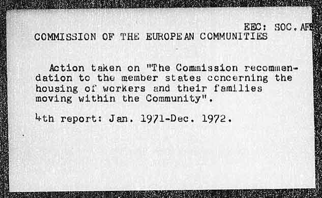 BEC: SOC. A COMMISSION OF THE EUROPEAN COMMUNITIES Action taken on "Ihe Commission recommen- dation to the member states concerning the housing of workers and their families moving within the Community”. Lith report: Jan. 1971-Dec. 1972.
