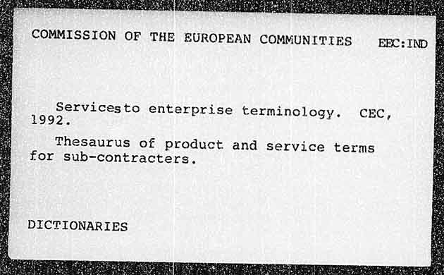 COMMISSION OF THE EUROPEAN COMMUNITIES EEC: IND § Servicesto enterprise terminology. CEC, O92 Thesaurus of product and service terms for sub-contracters. DICTIONARIES