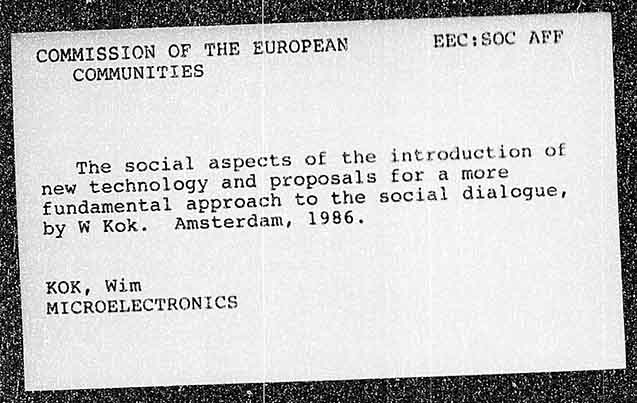 Pace COMMISSION OF THE EUROPEAN BEC:SOC AFF COMMUNITIES The social aspects of the introduction of new technology and proposals for a more fundamental approach to the social dialogue, by W Kok. Amsterdam, 1986. KOK, Wim MICROELECTRONICS