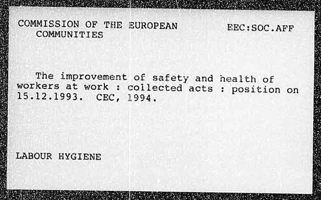 COMMISSION OF THE EUROPEAN BEC:SOC.AFF COMMUNITIES The improvement of safety and health of workers at work : collected acts : position on 15.12.1993. CEC, 1994, LABOUR HYGIENE
