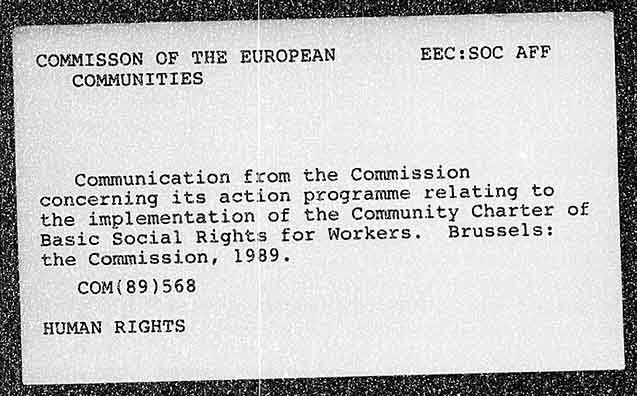 COMMISSON OF THE EUROPEAN EEC:SOC AFF COMMUNITIES Communication firom the Commission concerning its action programme relating to the implementation of the Community Charter Basic Social Rights for Workers. Brussels: the Commission, 1989. COM(89)568 HUMAN RIGHTS