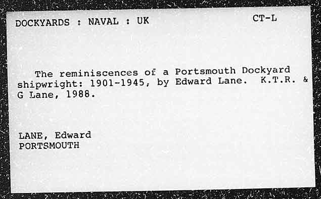 oi Dr ae EY STP: beer REY I ir tae Char Sh Vee Rt ar rans BP eeree eS LEU GN rer lees taan ee DOCKYARDS : NAVAL The reminiscences of a Portsmouth Dockyard shipwright: 1901-1945, by Edward Lane. K.T.R. G Lane, 1986. LANE, Edward PORTSMOUTH