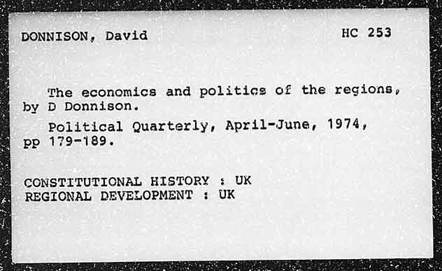 DONNISON, David The economics and politics of the regions, by D Donnison. Political Quarterly, April-June, 1974, pp 179-189. CONSTITUTIONAL HISTORY « UK REGIONAL DEVELOPMENT : UK