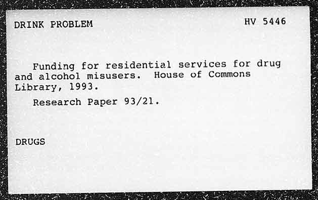 DRINK PROBLEM HV 5446 Funding for residential services for drug and alcohol misusers. House of Commons Library, 1993. Research Paper 93/21. DRUGS