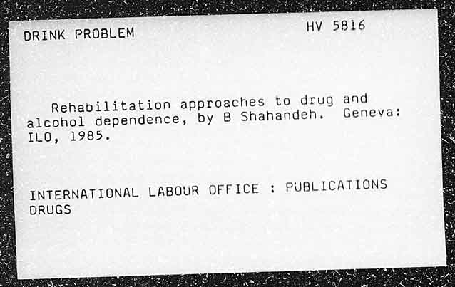 Rae 4 neers ea aT DRINK PROBLEM Rehabilitation approaches to drug and alcohol dependence, by B Shahandeh. Geneva: TeO ee 1985. INTERNATIONAL LABOUR OFFICE : PUBLICATIONS BRUGS