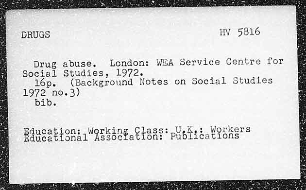 DRUGS HY 5816 Drug abuse. London: WEA Service Centre for Social Studies, 1972. 16p. (Background Notes on Social Studles 1972 no.3) bib. Race on: .W in pqucatt ans tonal Assoc