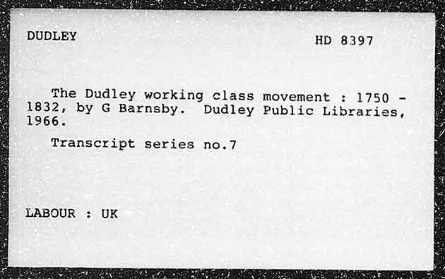 DUDLEY HD 8397 The Dudley working class movement : 1750 - 1832, by G Barnsby. Dudley Public Libraries, 1966. Transcript series no.7 LABOUR : UK