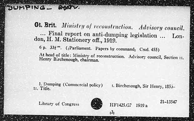 Gt. Brit. Ministry of reconstruction. Advi sory council, ... Final report on anti-dumping legislation .... Lon- don, H. M. Stationery off., 1919. 6p. 334°". (Parliament, Papers by command, Crd, 455) At head of title: Ministry of reconstruction. Advisory council, Section 11, Henry Birchenough, chairman. 1. Dumping (Commercial policy) 1. Bircherough, Sir Henry, 1855~ u, Title. 21-13547 Library of Congress HF1425.G7 1919 a