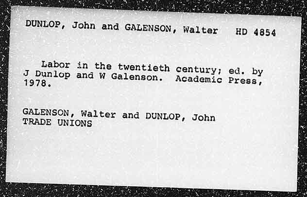 DUNLOP, John and GALENSON, Walter HD 4854 Labor in the twentieth century; ed. by J Dunlop and w Galenson. Academic Press, 1978. GALENSON, Walter and DUNLOP, John TRADE UNIONS