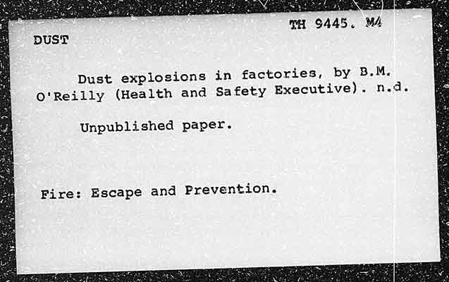Riedl oA48. MA ft DUST Dust explosions in factories, by 8.M. O'Reilly (Health and Safety Executive). n.d. Unpublished paper. Fire: Escape and Prevention.