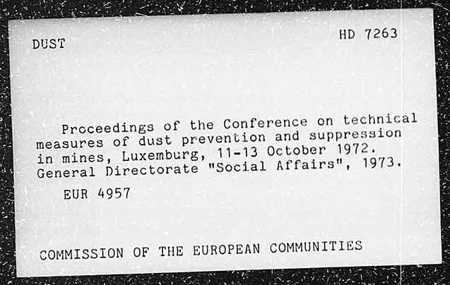 HD 7263 Proceedings of the Conference on technical measures of dust prevention and suppression in mines, Luxemburg, 144-13 October 1972. General Directorate "Social Affairs", 1973. EUR 4957 COMMISSION OF THE EUROPEAN COMMUNITIES