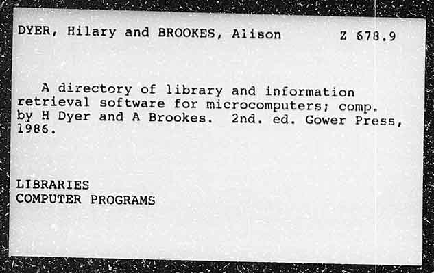 : A directory of library and information fm retrieval software for microcomputers; comp, jm by H Dyer and A Brookes. 2nd. ed. Gower Press, 1986. f] LIBRARIES fs COMPUTER PROGRAMS