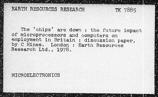 TK 7885 : The 'chips' are down : the future impact of microprocessors and computers on employment in Britain : discussion paper, by C Hines. London : Karthn Resources Research Ltd., 1978. MICROELECTRONICS
