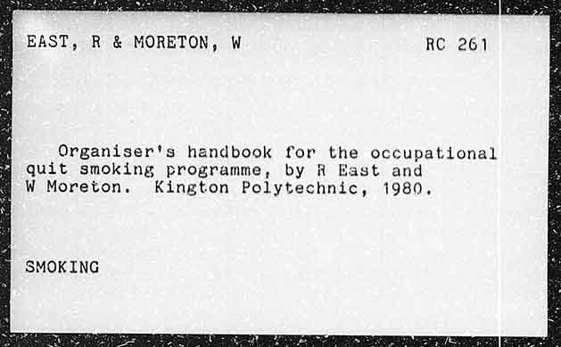 EAST, R & MORETON, W Organiser's handbook for the occupational quit smoking programme, by R East and W Moreton. Kington Polytechnic, 1980, SMOKING