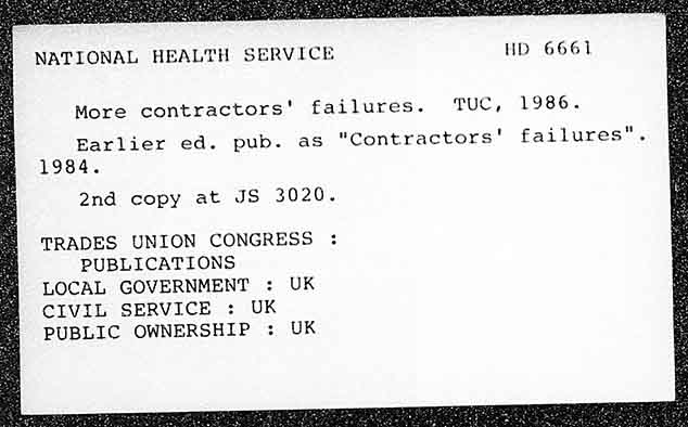 NATIONAL HEALTH SERVICE HD 6661 More contractorsÂ’ failures. Tuc, 1986. Barlier ed. pub. as "Contractors' failures". 1984. 2nd copy at JS 3020. TRADES UNION CONGRESS PUBLICATIONS LOCAL GOVERNMENT : UK CIVIL SERVICE : UK PUBLIC OWNERSHIP : UK