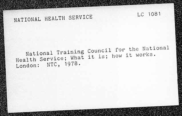 NATIONAL HEALTH SERVICE EC40o" for the National National Training Council how it works. Health Service; What it.is; London: NTC, 1978.