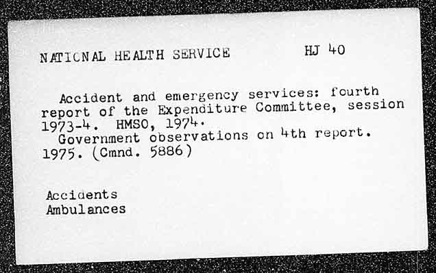 NATICNAL HEALTH SERVICE HJ 40 Accident and emergency services: fourth report of the Expenditure Committee, session 1973-4. HMSO, 1974+ Government observations on 4th report. 1975. (Cmnd. 5886) Accidents Ambulances