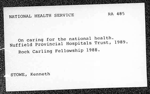 NATIONAL HEALTH SERVICE RA 485 On caring for the national health. 1989. Nuffield Provincial Hospitals Trust, Rock Carling Fellowship 1988. STOWE, Kenneth