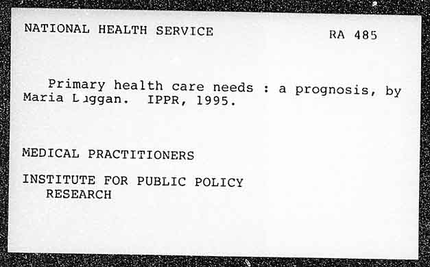 NATIONAL HEALTH SERVICE Primary health care needs : a prognosis, by Maria Liggan. IPPR, 1995. MEDICAL PRACTITIONERS INSTITUTE FOR PUBLIC POLICY RESEARCH