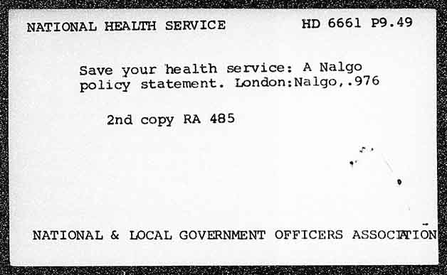 NATIONAL HEALTH SERVICE HD 6661 P9.49 Save your health service: A Nalgo policy statement. London: Naigo, .976 2nd copy RA 485 NATIONAL & LOCAL GOVERNMENT OFFICERS ASSOC IONE
