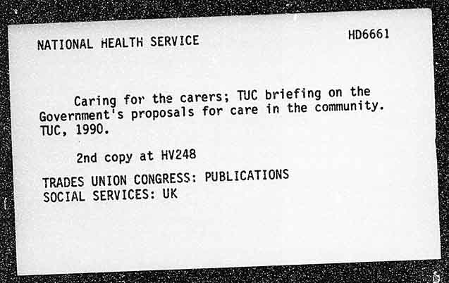NATIONAL HEALTH SERVICE HD6661 Caring for the carers; TUC briefing on the Government's proposals for care in the community. Tuc, 1990. 2nd copy at HV248 TRADES UNION CONGRESS: PUBLICATIONS SOCIAL SERVICES: UK