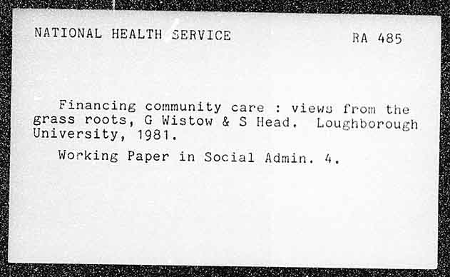 NATIONAL HEALTH SERVICE Financing community care : views from the Brass roots, G Wistow & S Head. Loughborough University, 1981. Working Paper in Social Admin. 4