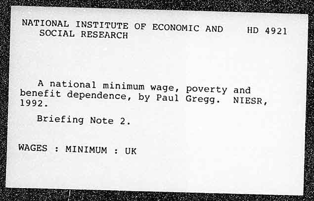 NATIONAL INSTITUTE OF ECONOMIC AND HD 492] SOCIAL RESEARCH A national minimum wage, poverty and benefit dependence, by Paul Gregg. NIESR, 1992. Briefing Note 2, WAGES : MINIMUM : UK